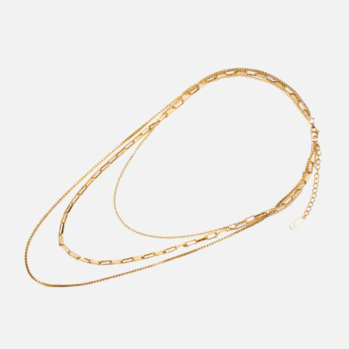 Die dreiteilige Komposition aus fein abgestuften Kettenstrukturen erzeugt eine elegante Tiefe, die sowohl einzeln als auch in Kombination getragen ihre Wirkung entfaltet.